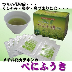 「べにふうき」茶には花粉症やアトピーなどのアレルギー反応を抑制するメチル化カテキンとストリクチニンという成分が多く含まれています。テアニン、ビタミンなどの成分やカテキン類も一般の緑茶と同様に含まれています